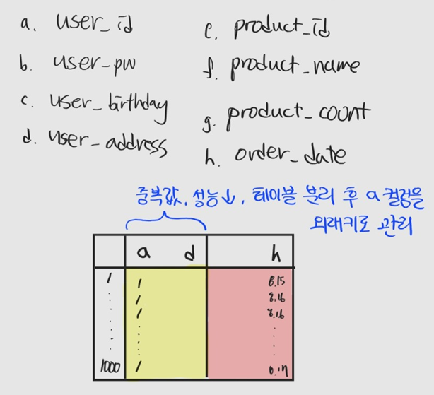 이 사이트의 유일한 단골인 한 사용자가 두 달동안 물건을 1000개 샀다. 컬럼 a, b, c, d는 같은 사용자에 대한 정보가 들어갈 것이고 기껏해야 e, f, g, h 컬럼 내용만 달라질 것이다. 같은 정보를 반복해서 저장하는 것은 메모리 낭비다.